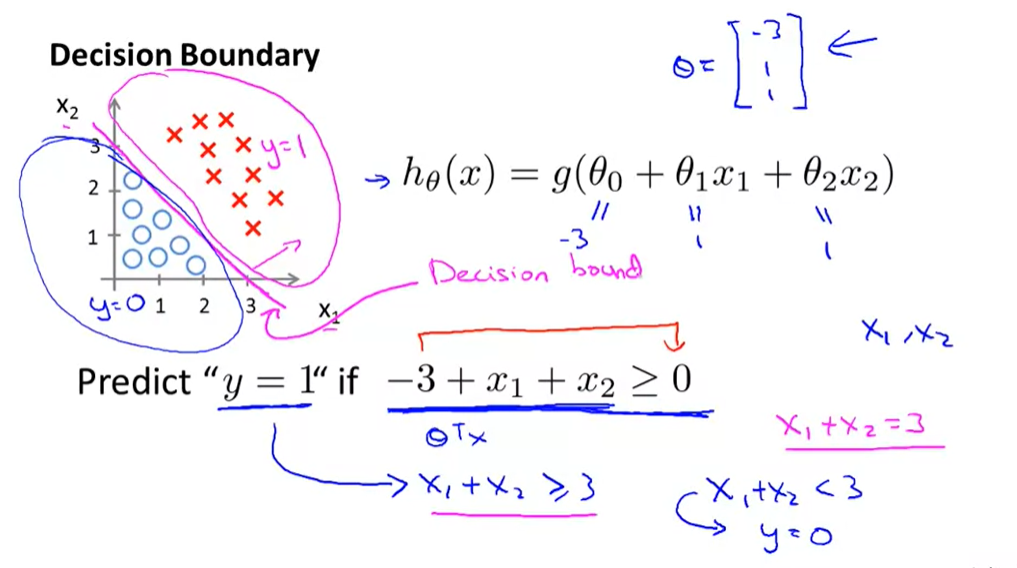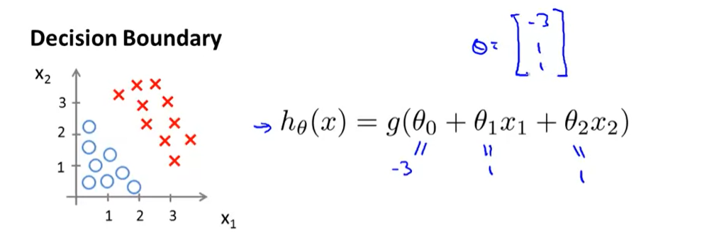 Thedecision boundaryis the line that separates the area where y = 0 and where y = 1. It is created by our hypothesis function.