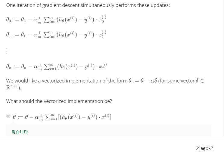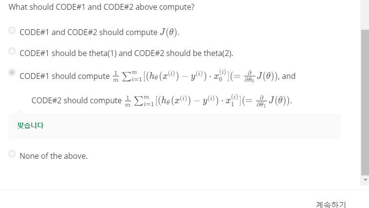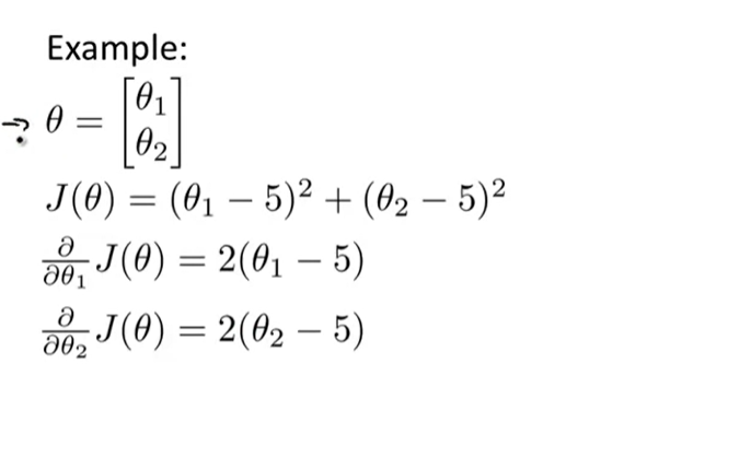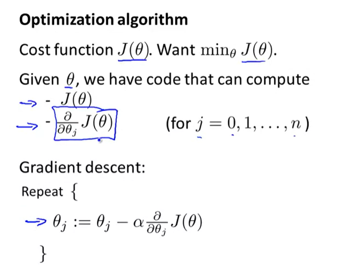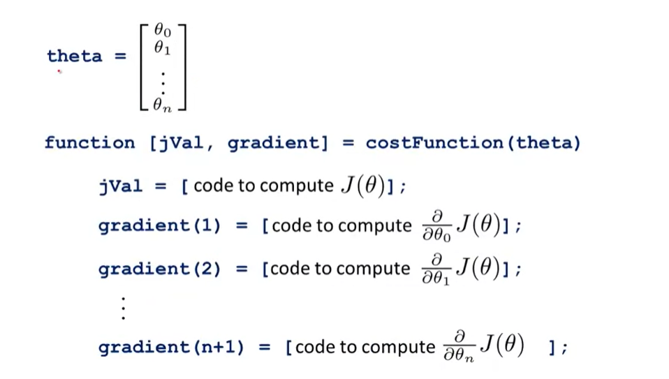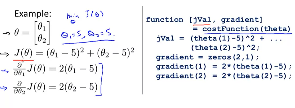 Given code that can do these two things, what gradient descent does is it repeatedly performs the following update. Right? So given the code that we wrote to compute these partial derivatives, gradient descent plugs in here and uses that to update our parameters theta.But let me just tell you about some of their properties. 2분 40초부터 동영상을 재생하고 스크립트 따르기2:40These three algorithms have a number of advantages. One is that, with any of this algorithms you usually do not need to manually pick the learning rate alpha. 2분 50초부터 동영상을 재생하고 스크립트 따르기2:50So one way to think of these algorithms is that given is the way to compute the derivative and a cost function. You can think of these algorithms as having a clever inter-loop. And, in fact, they have a clever 3분 1초부터 동영상을 재생하고 스크립트 따르기3:01inter-loop called a line search algorithm that automatically tries out different values for the learning rate alpha and automatically picks a good learning rate alpha so that it can even pick a different learning rate for every iteration. And so then you don't need to choose it yourself.The value that minimizes it is going to be theta 1 equals 5, theta 2 equals equals five. 6분 15초부터 동영상을 재생하고 스크립트 따르기6:15Now, again, I know some of you know more calculus than others, but the derivatives of the cost function J turn out to be these two expressions. I've done the calculus. 6분 26초부터 동영상을 재생하고 스크립트 따르기6:26So if you want to apply one of the advanced optimization algorithms to minimize cost function J. So, you know, if we didn't know the minimum was at 5, 5, but if you want to have a cost function 5 the minimum numerically using something like gradient descent but preferably more advanced than gradient descent, what you would do is implement an octave function like this, so we implement a cost function, the first J-val, is how 6분 58초부터 동영상을 재생하고 스크립트 따르기6:58we would compute the cost function J. And so this says J-val equals, you know, theta one minus five squared plus theta two minus five squared. So it's just computing this cost function over here. 7분 10초부터 동영상을 재생하고 스크립트 따르기7:10And the second argument that this function returns is gradient. So gradient is going to be a two by one vector, 7분 18초부터 동영상을 재생하고 스크립트 따르기7:18and the two elements of the gradient vector correspond to the two partial derivative terms over here. 7분 27초부터 동영상을 재생하고 스크립트 따르기7:27Having implemented this cost function, 7분 29초부터 동영상을 재생하고 스크립트 따르기7:29you would, you can then 7분 31초부터 동영상을 재생하고 스크립트 따르기7:31call the advanced optimization 7분 34초부터 동영상을 재생하고 스크립트 따르기7:34function called the fminunc - it stands for function minimization unconstrained in Octave -and the way you call this is as follows. function called the fminunc - it stands for function minimization unconstrained in Octave -and the way you call this is as follows. You set a few options. This is a options as a data structure that stores the options you want. So grant up on, this sets the gradient objective parameter to on. It just means you are indeed going to provide a gradient to this algorithm. I'm going to set the maximum number of iterations to, let's say, one hundred. We're going give it an initial guess for theta. There's a 2 by 1 vector. And then this command calls fminunc. This at symbol presents a pointer to the cost function The function value at the optimum is essentially 10 to the minus 30. So that's essentially zero, which is also what we're hoping for. And the exit flag is 1, and this shows what the convergence status of this. And if you want you can do help fminunc to read the documentation for how to interpret the exit flag. But the exit flag let's you verify whether or not this algorithm thing has converged.