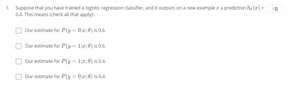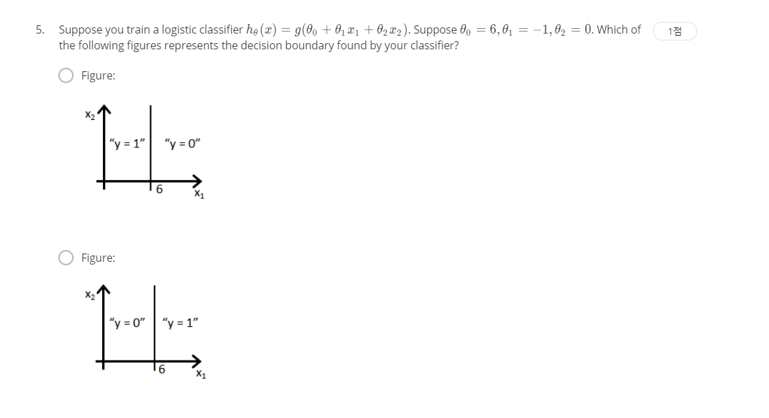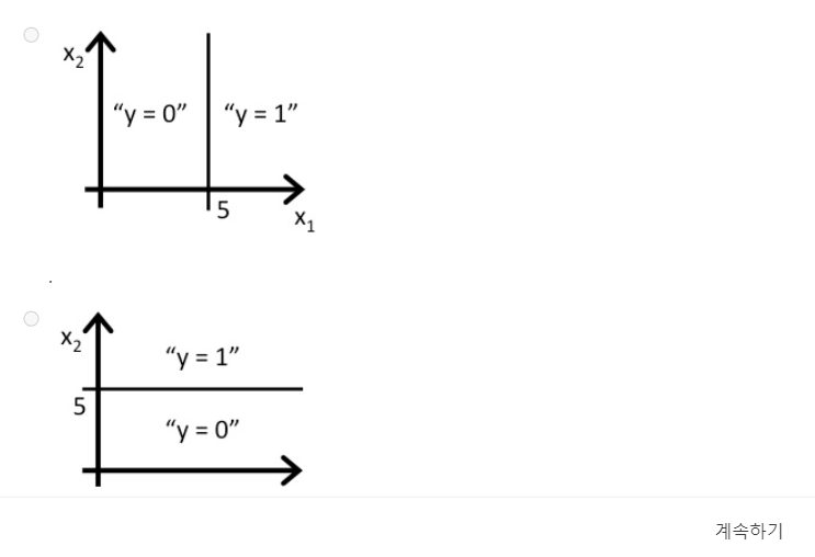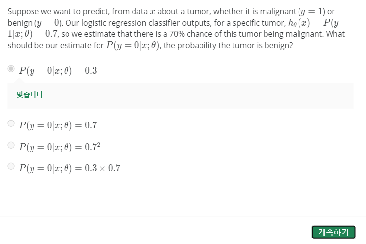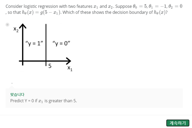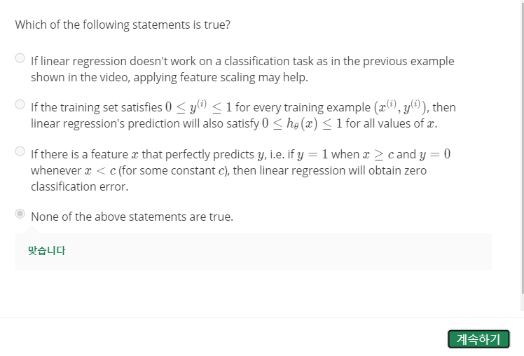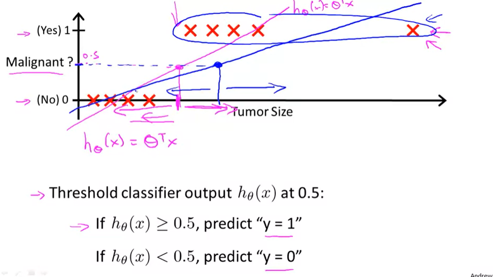 But once we've added that extra example over here, if you now run linear regression, you instead get a straight line fit to the data. That might maybe look like this. 4분 57초부터 동영상을 재생하고 스크립트 따르기4:57 And if you know threshold hypothesis at 0.5, you end up with a threshold that's around here, so that everything to the right of this point you predict as positive and everything to the left of that point you predict as negative. So, applying linear regression to a classification problem often isn't a great idea. In the first example, before I added this extra training example, previously linear regression was just getting lucky and it got us a hypothesis that worked well for that particular example, but usually applying linear regression to a data set, you might get lucky but often it isn't a good idea. So I wouldn't use linear regression for classification problems.Here's one other funny thing about what would happen if we were to use linear regression for a classification problem. For classification we know that y is either zero or one. But if you are using linear regression where the hypothesis can output values that are much larger than one or less than zero, even if all of your training examples have labels y equals zero or one. 6분 53초부터 동영상을 재생하고 스크립트 따르기6:53And it seems kind of strange that even though we know that the labels should be zero, one it seems kind of strange if the algorithm can output values much larger than one or much smaller than zero. 7분 9초부터 동영상을 재생하고 스크립트 따르기7:09So what we'll do in the next few videos is develop an algorithm called logistic regression, which has the property that the output, the predictions of logistic regression are always between zero and one, and doesn't become bigger than one or become less than zero.
