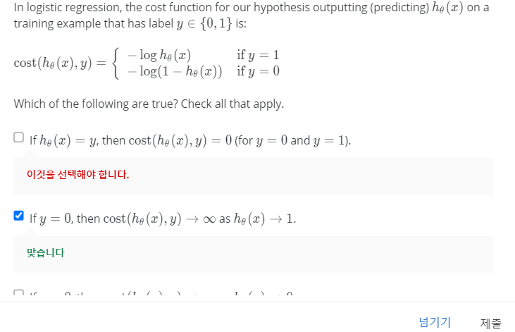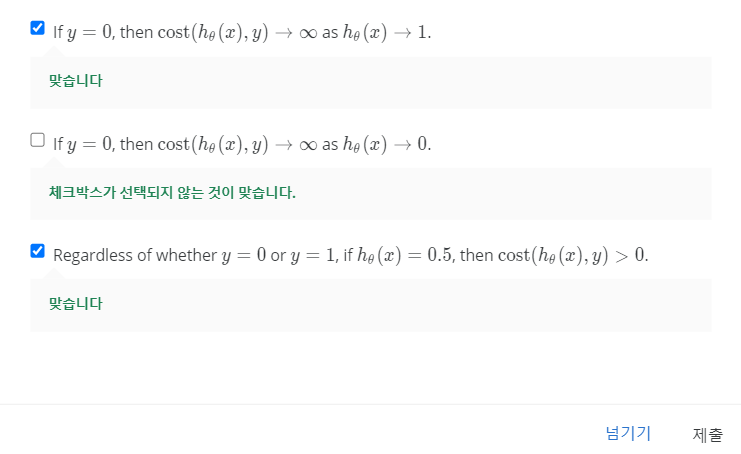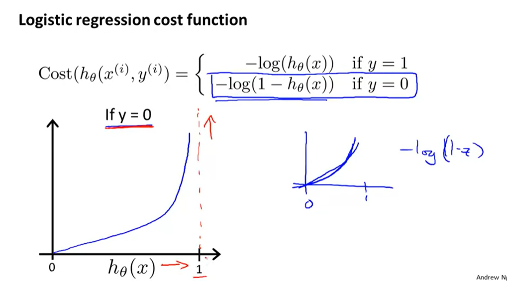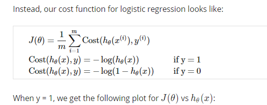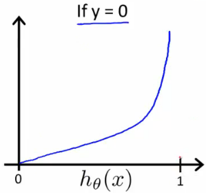 Similarly, when y = 0, we get the following plot forJ(\theta)J(θ)vsh_\theta (x)hθ(x):