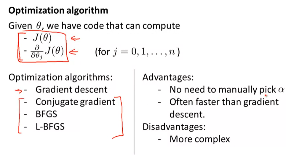 "Conjugate gradient", "BFGS", and "L-BFGS" are more sophisticated, faster ways to optimize θ that can be used instead of gradient descent. A. Ng suggests not to write these more sophisticated algorithms yourself (unless you are an expert in numerical computing) but use the libraries instead, as they're already tested and highly optimized. Octave provides them.