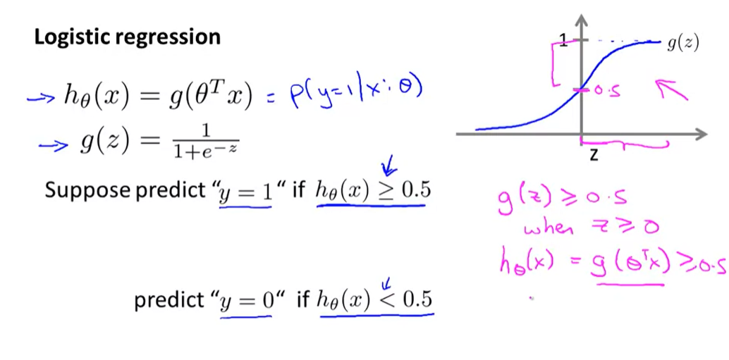 hθ(x)=g(θTx)≥0.5whenθTx≥0