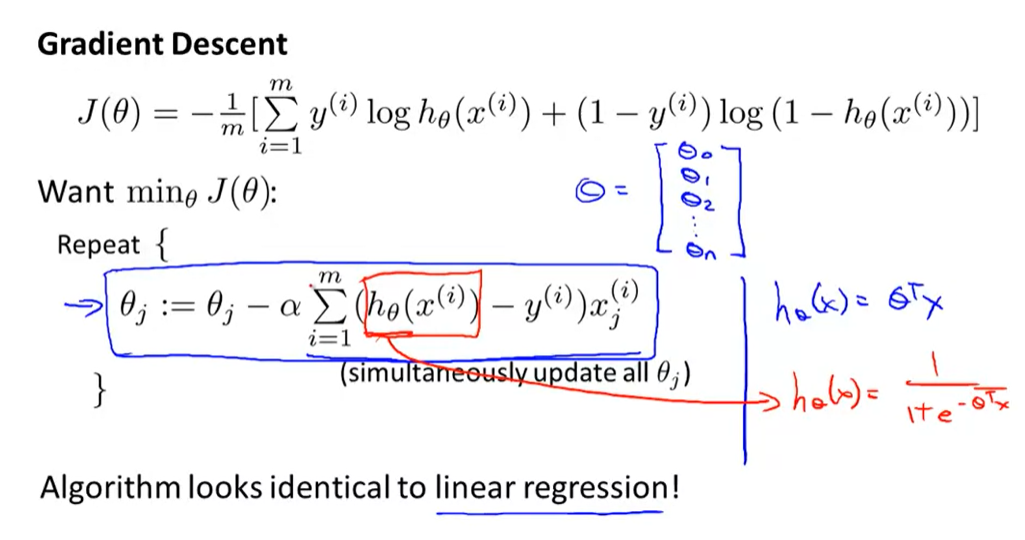 what has changed is that the definition for this hypothesis has changed. So as whereas for linear regression, we had h(x) equals theta transpose X, now this definition of h(x) has changed. And is instead now one over one plus e to the negative transpose x. So even though the update rule looks cosmetically identical, because the definition of the hypothesis has changed, this is actually not the same thing as gradient descent for linear regression.