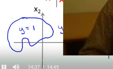 So can we come up with even more complex decision boundaries then this? If I have even higher polynomial terms so things like 13분 32초부터 동영상을 재생하고 스크립트 따르기13:32X1 squared, X1 squared X2, X1 squared equals squared and so on. And have much higher polynomials, then it's possible to show that you can get even more complex decision boundaries and the regression can be used to find decision boundaries that may, for example, be an ellipse like that or maybe a little bit different setting of the parameters maybe you can get instead a different decision boundary which may even look like some funny shape like that.