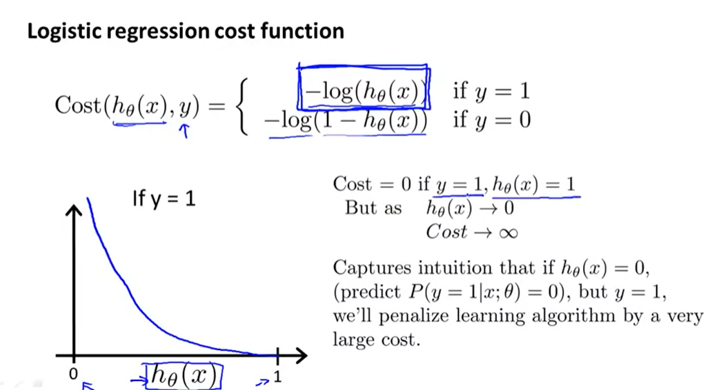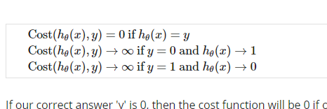 Cost(hθ(x),y)=0 if hθ(x)=yCost(hθ(x),y)→∞ if y=0andhθ(x)→1Cost(hθ(x),y)→∞ if y=1andhθ(x)→0