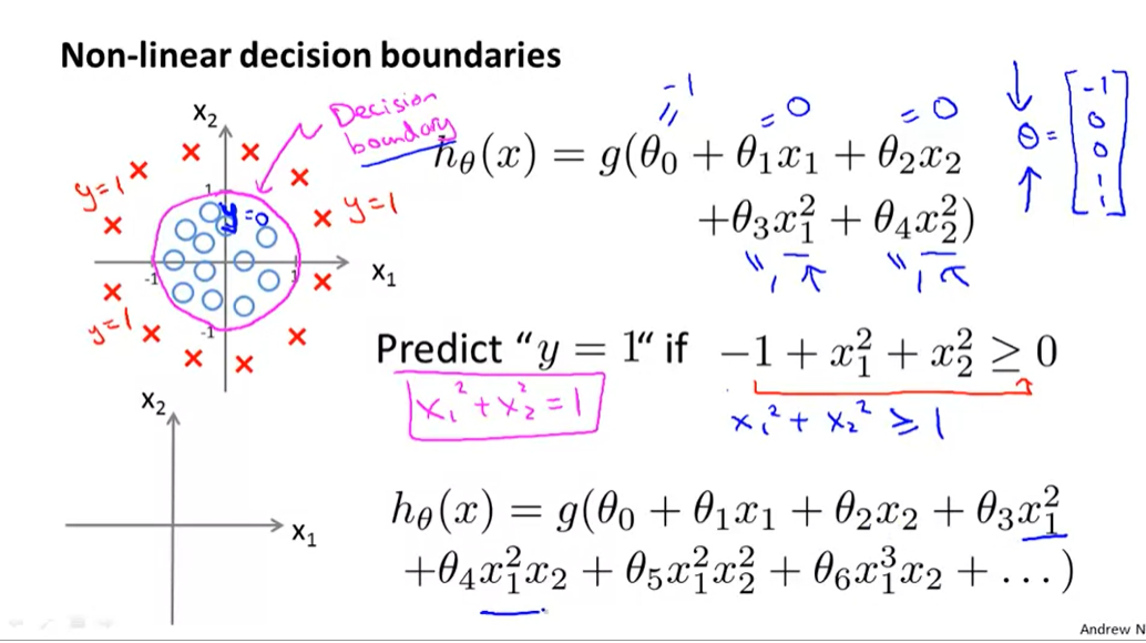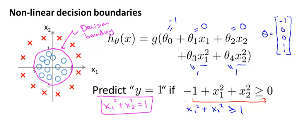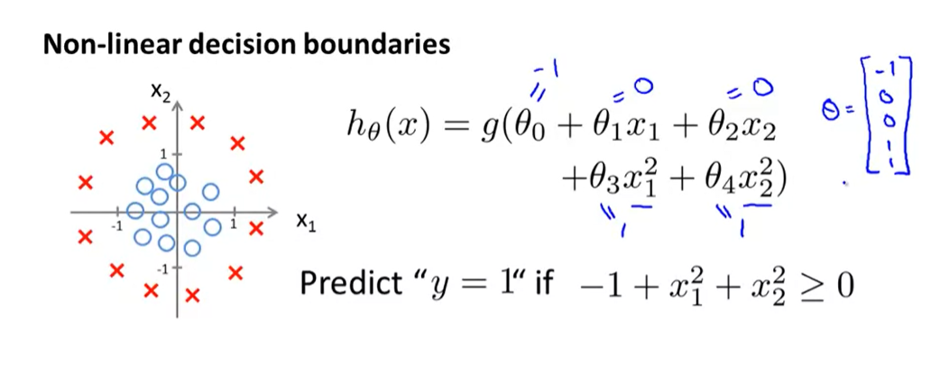 Earlier when we were talking about polynomial regression or when we're talking about linear regression, we talked about how we could add extra higher order polynomial terms to the features. And we can do the same for logistic regression. Concretely, let's say my hypothesis looks like this where I've added two extra features, x1 squared and x2 squared, to my features. So that I now have five parameters, theta zero through theta four. What this means is that with this particular choose of parameters, my parameter effect theta theta looks like minus one, zero, zero, one, one.