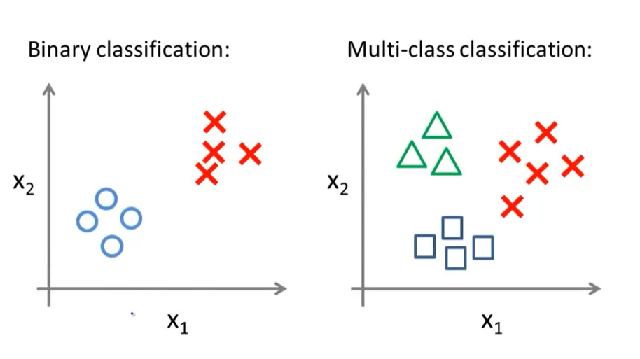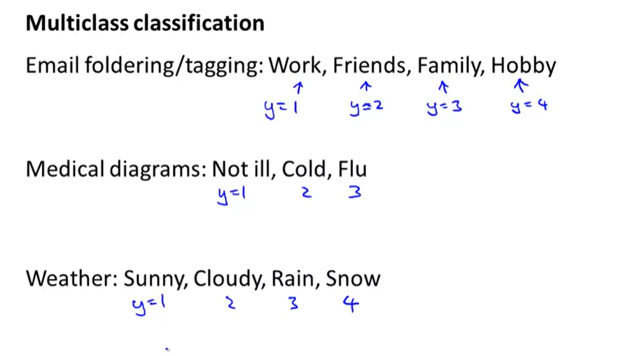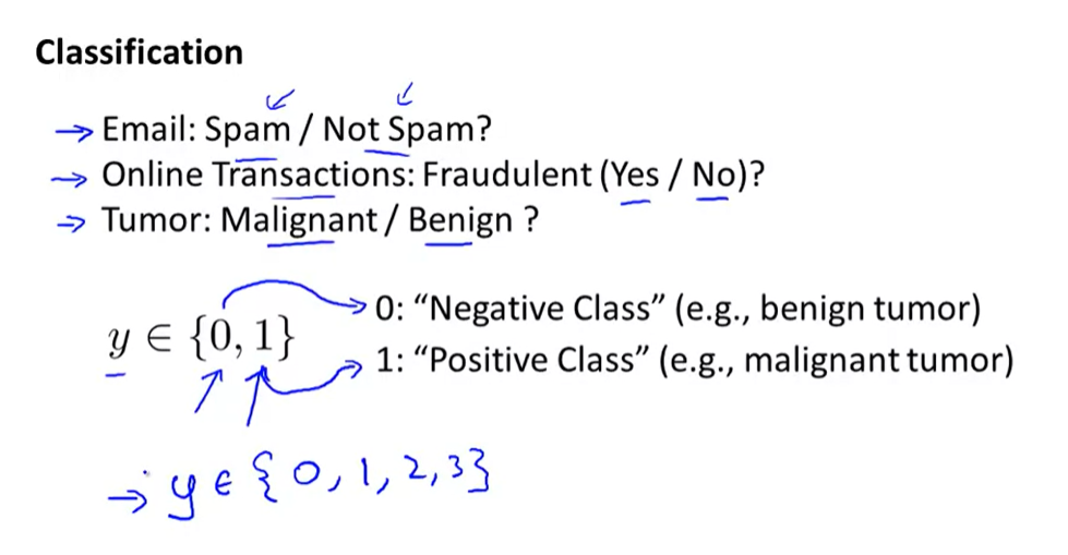 we'll talk about multi class problems as well where therefore y may take on four values zero, one, two, and three. This is called a multiclass classification problem. But for the next few videos, let's start with the two class or the binary classification problem and we'll worry about the multiclass setting later.