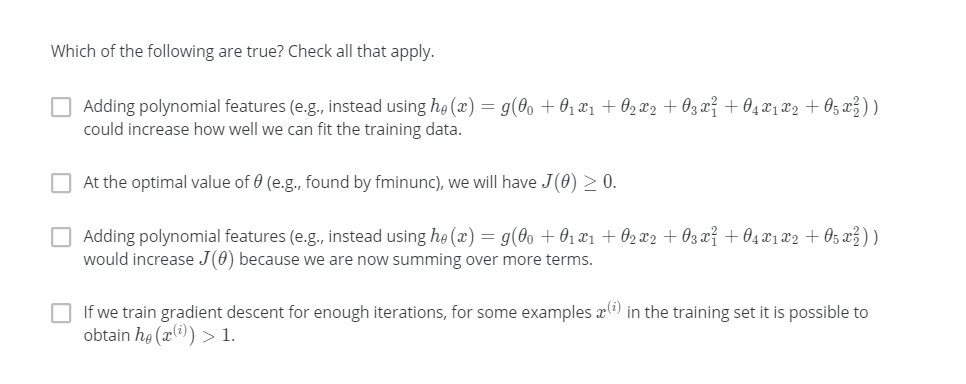 Again, the input to the sigmoid function g(z) (e.g.\theta^T XθTX) doesn't need to be linear, and could be a function that describes a circle (e.g.z = \theta_0 + \theta_1 x_1^2 +\theta_2 x_2^2z=θ0+θ1x12+θ2x22) or any shape to fit our data.