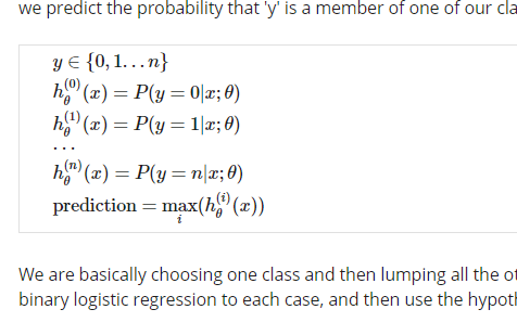 In this case we divide our problem into n+1 (+1 because the index starts at 0) binary classification problems; in each one, we predict the probability that 'y' is a member of one of our classes.