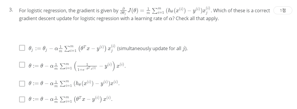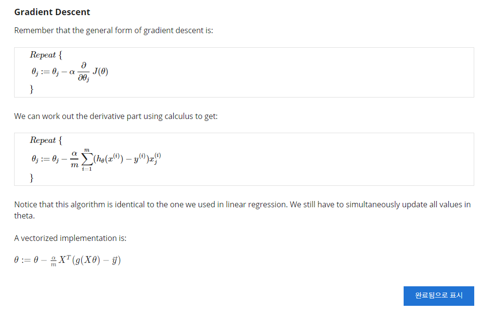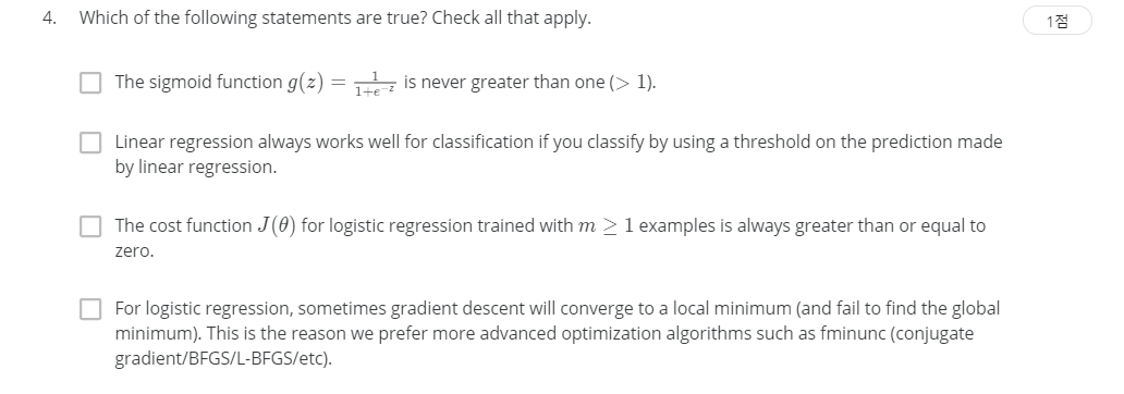 만약 classifcation문제에서 앞의 regression 문제처럼 linear regression을 사용하게 되면 0,1 만 나뉘어지는 자료에서 0,1외의 수가 나오는 것은 물론이고 위의 예처럼 완전 동떨어진 예가 있다면 그 중간 (평균)이 지나치게 치우쳐지는 문제가 일어난다. 따라서 classifcation 문제에서는 sigmoid function 즉 지수함수를 이용해서 h(x)를 표현하게 되고 그 결과 logistic regression 함수가 나오게 된다. classifcation 문제이지만 logistic 'regression'이름인것은 가볍게 인정하도록 하자.