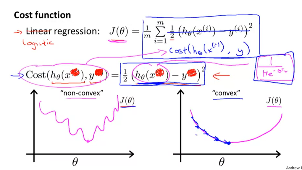 Note that writing the cost function in this way guarantees that J(θ) is convex for logistic regression.