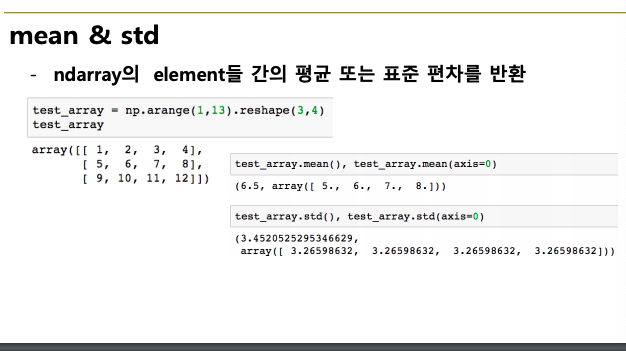 - ndarray의 element들 간의 평균 또는 표준 편차를 반환