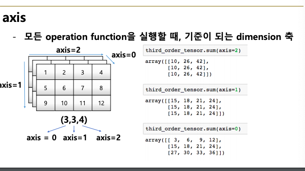 - ndarray의 element들 간의 합을 구함, list의 sum 기능과 동일